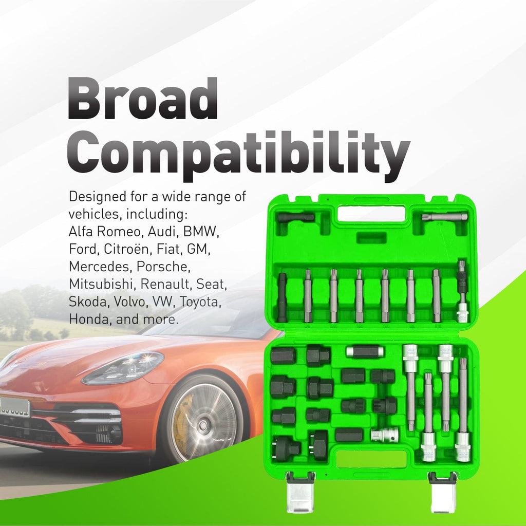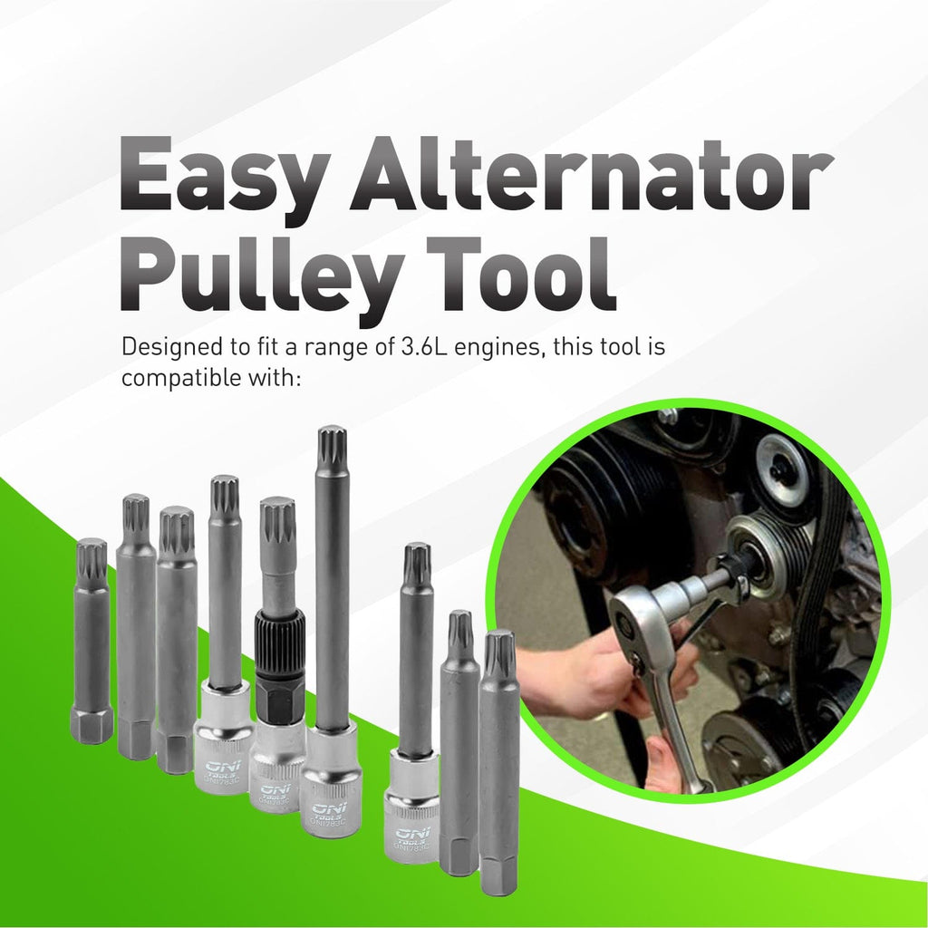 Oni Tools 30PCS Alternator Pulley Removal and Installation Tool Kit gives technicians the coverage they need for modern overrunning alternator pulleys. This comprehensive socket and bit set handles Bosch, Marelli and Valeo style freewheel pulleys used on many Audi, BMW, Ford, GM, Mercedes, VW, Volvo, Toyota, Honda and other engines. TRX‑star, spline and hex drivers let you hold the alternator shaft securely while releasing or installing the decoupler pulley without damage. Each piece is manufactured from hardened chrome vanadium steel for high torque strength, corrosion resistance and long workshop life. A molded carry case keeps components organized so you can quickly grab the right adapter at the vehicle. Ideal for dealership, independent and fleet technicians, yet straightforward enough for advanced DIY users who want professional results when servicing charging systems.