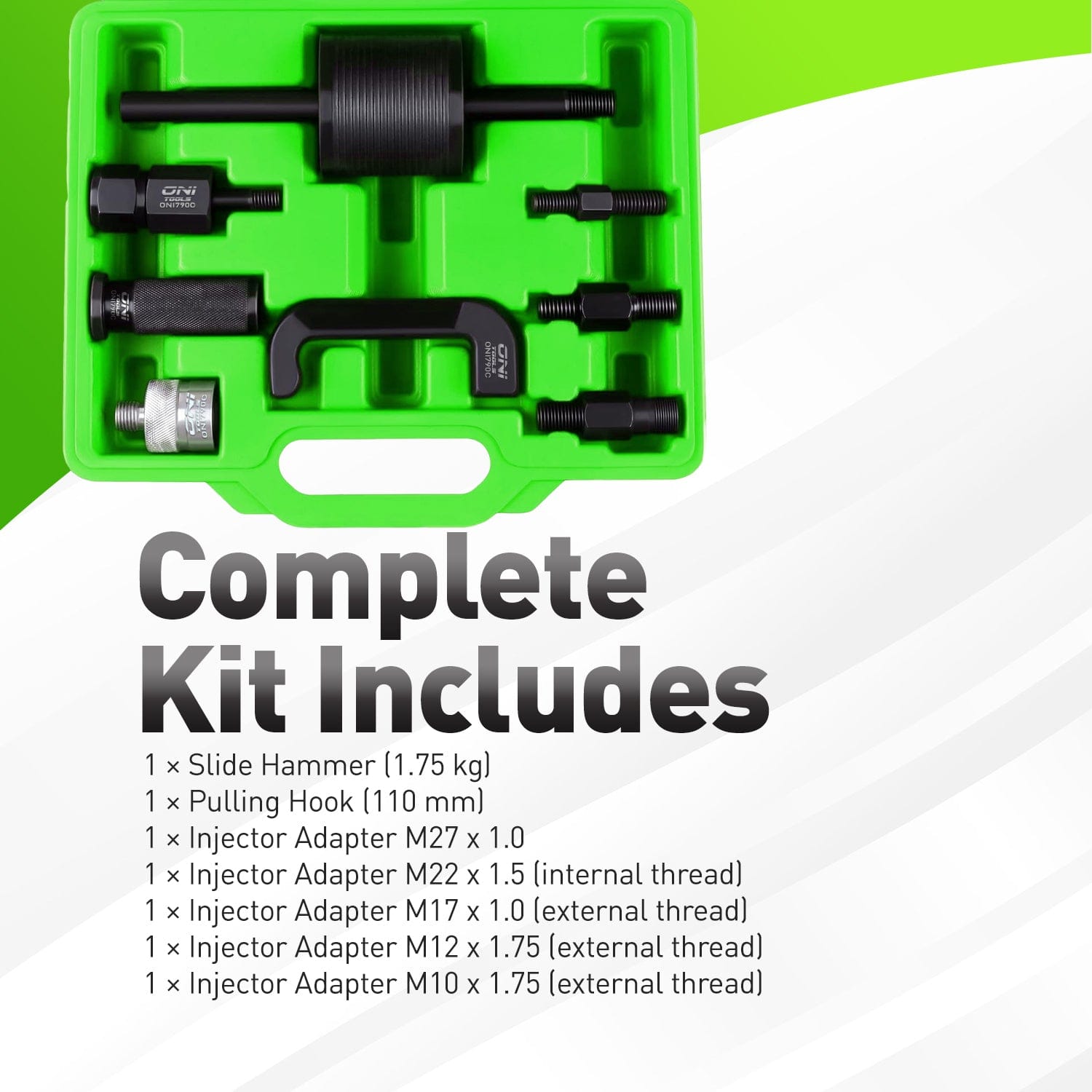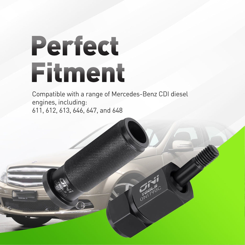 The Oni Tools Diesel Injector Puller Slide Hammer Kit is engineered for fast, damage-free removal of stubborn common rail diesel injectors on Mercedes-Benz CDI engines 611, 612, 613, 646, 647 and 648. This professional injector extractor system uses a robust slide hammer and precision puller jaw with a selection of threaded adapters to clamp securely to Bosch-type and other CDI injectors, allowing you to pull seized injectors without removing the cylinder head or disturbing the valve train.