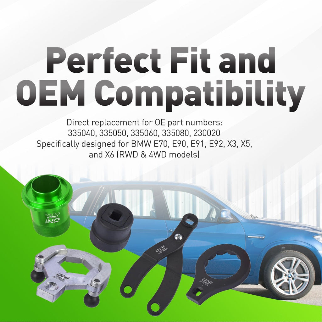 Service BMW rear final drives the right way with the Oni Tools Rear Drive Axle Differential Installer Remover Kit. Engineered as an alternative to OEM tool set numbers 335040, 335050, 335060, 335080 and 230020, this kit is designed specifically for rear drive axle differential work on BMW E70/E90/E91/E92 3‑Series and X3, X5, X6 models in both RWD and xDrive/4WD configurations.