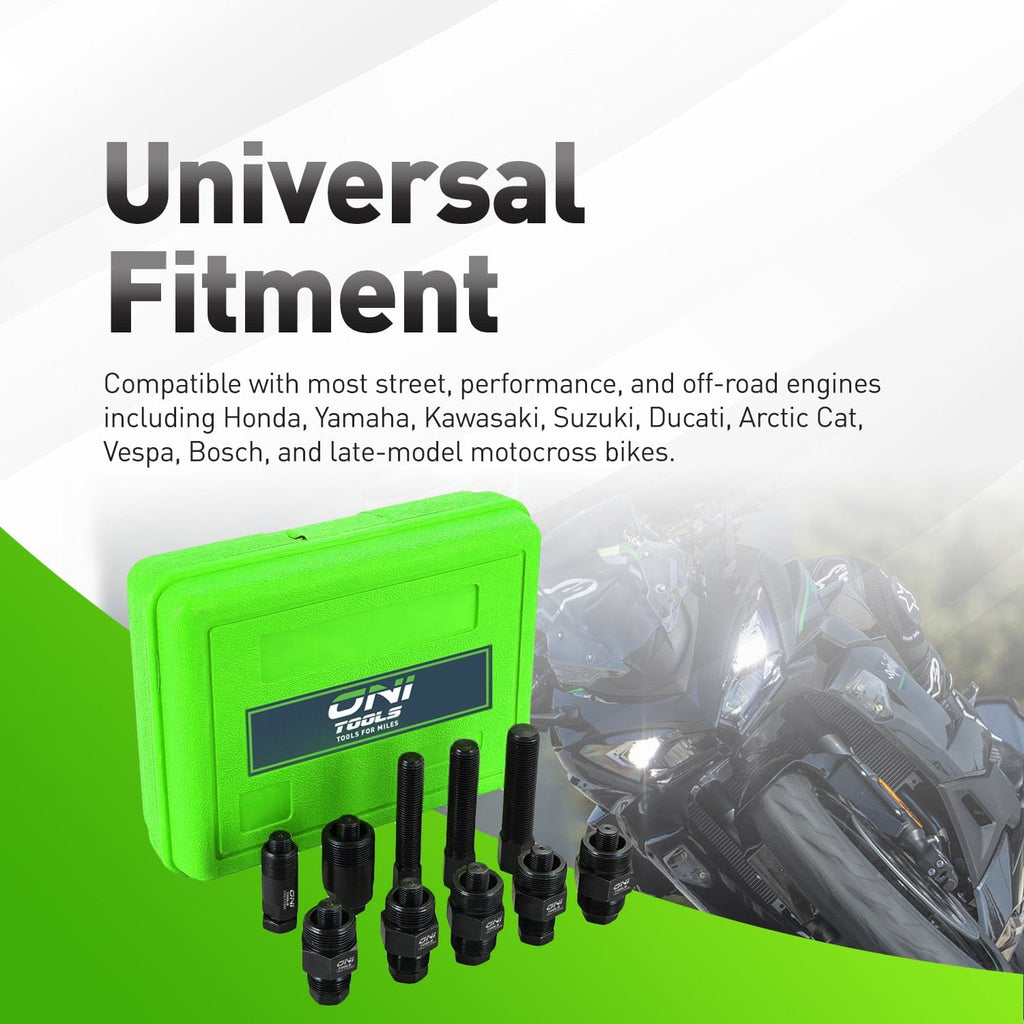 Oni Tools’ 10-Piece Motorcycle/ATV Flywheel Puller Set is designed to separate stubborn flywheels and magneto rotors from crankshaft tapers without hammering or damage. This metric external-thread kit covers a wide range of common puller sizes (including single- and double-ended options) for motorcycles, ATVs, dirt bikes, and scooters. Each puller is clearly size-marked for quick selection, and the set stores in a rugged blow-molded case to keep your toolbox organized on the bench or on the go. Built for pros but easy for DIY users, it’s the smart alternative when you need dependable flywheel removal for routine service, stator work, or clutch/engine repairs.