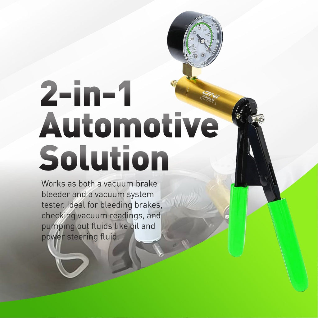 Take control of brake, clutch, and vacuum-system service with the Oni Tools Handheld Vacuum Pump Tester & Brake Bleeder Kit. This 2-in-1 kit helps you bleed brakes/clutch lines solo and diagnose vacuum issues with a clear 0–30 inHg (0–760 mmHg) gauge. Use it to pull trapped air from hydraulic systems or to test vacuum-operated components during troubleshooting. Built for repeated shop use with dependable sealing hoses and a rugged hand pump, it includes a reservoir jar, multiple adapters/connectors, and a carry case to keep everything organized. Great for pros and DIYers working on cars, trucks, motorcycles, and small engines—improve pedal feel, reduce service time, and confirm vacuum readings with confidence.