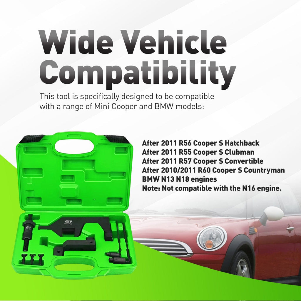 Get OE-level accuracy without the OE price. The Oni Tools N13/N18 Engine Timing Tool Kit locks the camshafts and crankshaft at exact TDC on 1.6L turbo BMW/MINI “Prince” engines, helping you set base timing correctly during timing chain, VVT, or cylinder head service. Precision-machined steel blocks hold alignment under shop use, while the TDC and tensioner locking pins simplify reassembly and reduce the risk of timing errors, misfires, or check-engine lights. Compatible with MINI Cooper S & JCW platforms (R55–R61) using the N18, and BMW 116i/118i (F20/F21) using the N13—see chart below. Whether you’re an independent shop or a serious DIYer, this kit delivers repeatable, factory-spec timing results and a clean, organized workflow thanks to the rugged molded case. Replace OE special tools at a fraction of the cost and finish the job right the first time.