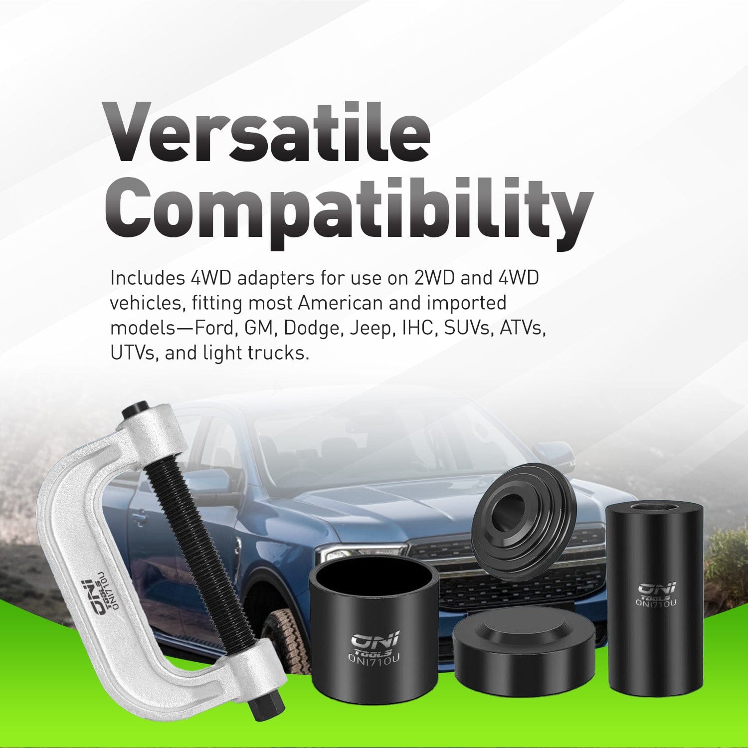 Tackle stubborn suspension and driveline work with the Oni Tools Ball Joint & U-Joint Press Service Kit. The heavy-duty C-frame delivers the force you need to remove and install press-fit ball joints, universal joints, and brake anchor pins without pulling control arms. A complete adapter set includes three receiver tubes (2-3/4"×3", 2-1/4"×2-1/2", 1-3/4"×2") plus installing and receiving cups for fast, repeatable setups. For 4WD service, this kit supports Dana 44 front axles found on many 1/2- and 3/4-ton trucks from 1967 to present, making it a versatile choice for shops and serious DIYers. Designed as an alternative to popular OEM tools and numbers—including 7249, 4004, T74P-4635-C, and J-45270—this pro-grade set helps you press seized components cleanly, protect knuckles, and finish jobs faster on 2WD and 4WD cars, SUVs, and light trucks.