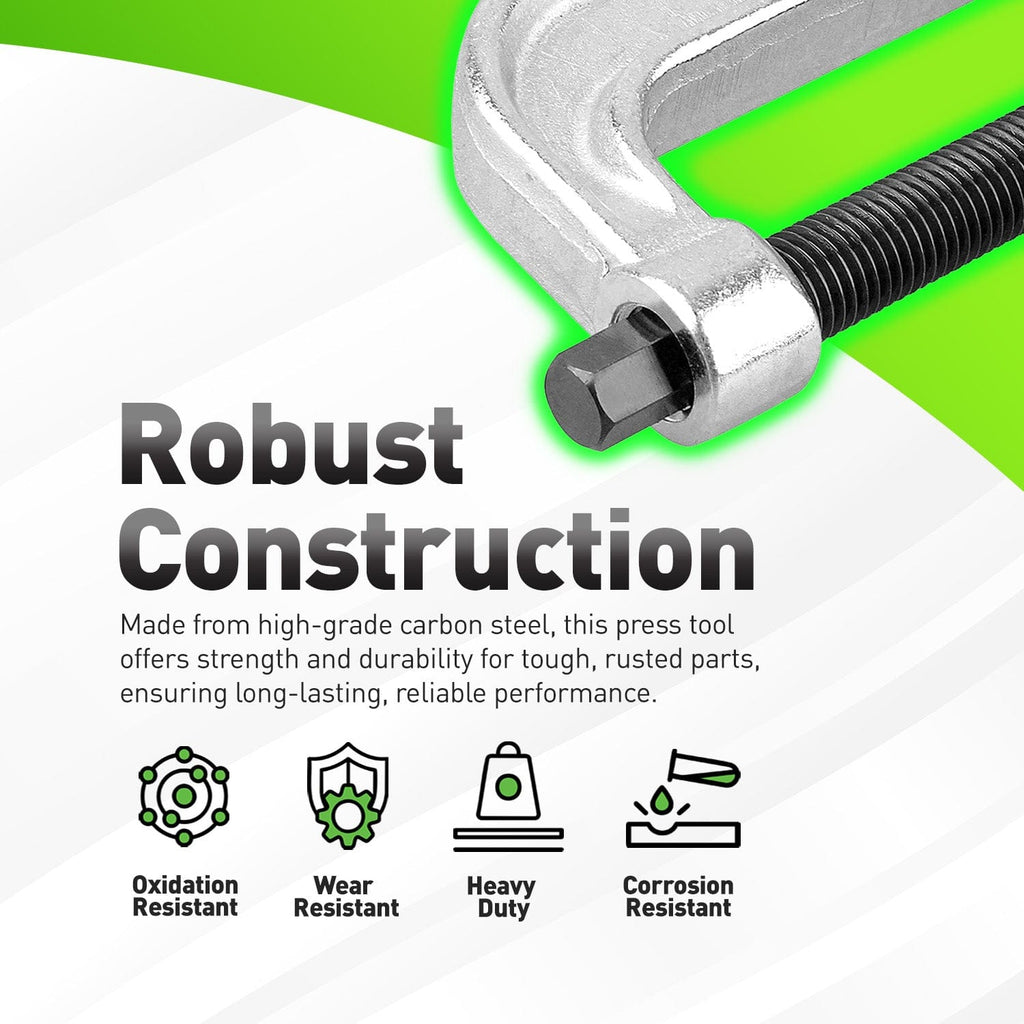 • Heavy-duty C-frame press removes/installs press-fit ball joints, U-joints & brake anchor pins; built for shop use.