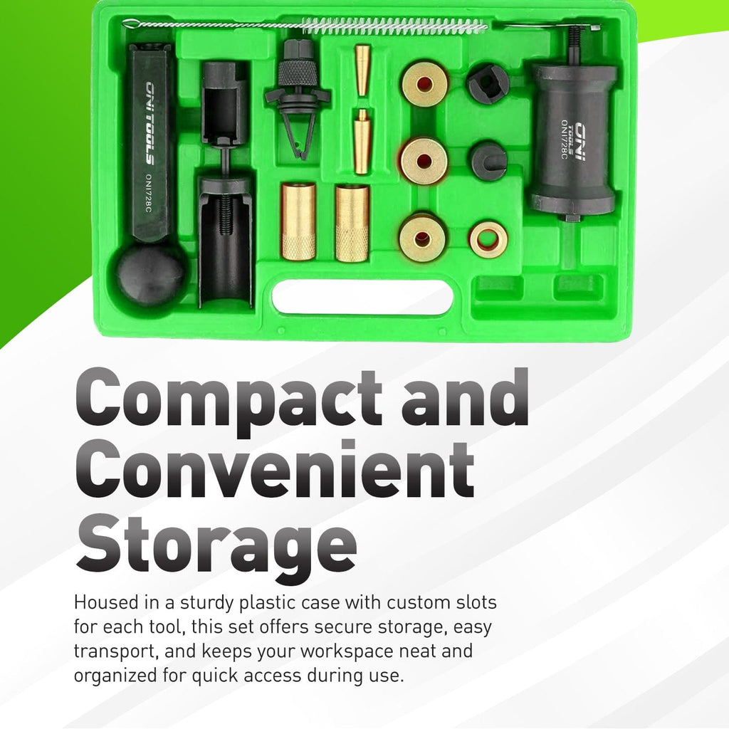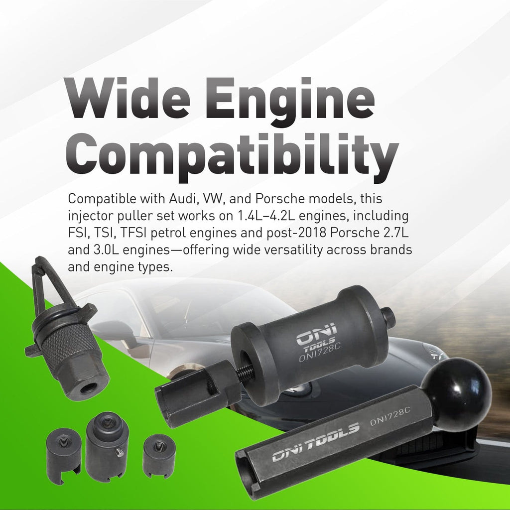 Service direct-injection VW/Audi engines the right way. The Oni Tools Injector & Combustion Chamber Seal Tool Set is engineered to remove stuck high-pressure injectors and correctly size/install the PTFE tip seal so the injector seats and seals as designed. Following OE service methodology, the kit includes a robust puller with sliding hammer plus assembly and calibration sleeves to resize the new Teflon ring and protect the nozzle during installation. Ideal for common 2.0T FSI/TFSI jobs and compatible with a wide range of FSI engines from 1.4 to 4.2L, this kit helps cure misfires, fuel odor, and compression loss caused by a damaged tip seal. It replaces OE tool references T10133C/T10133B and supports repairs using popular injector part numbers such as 06H906036P and 06D906036B. Packed in a labeled case for fast setup, Oni Tools gives professionals and advanced DIYers dealership-level results without dealership pricing.