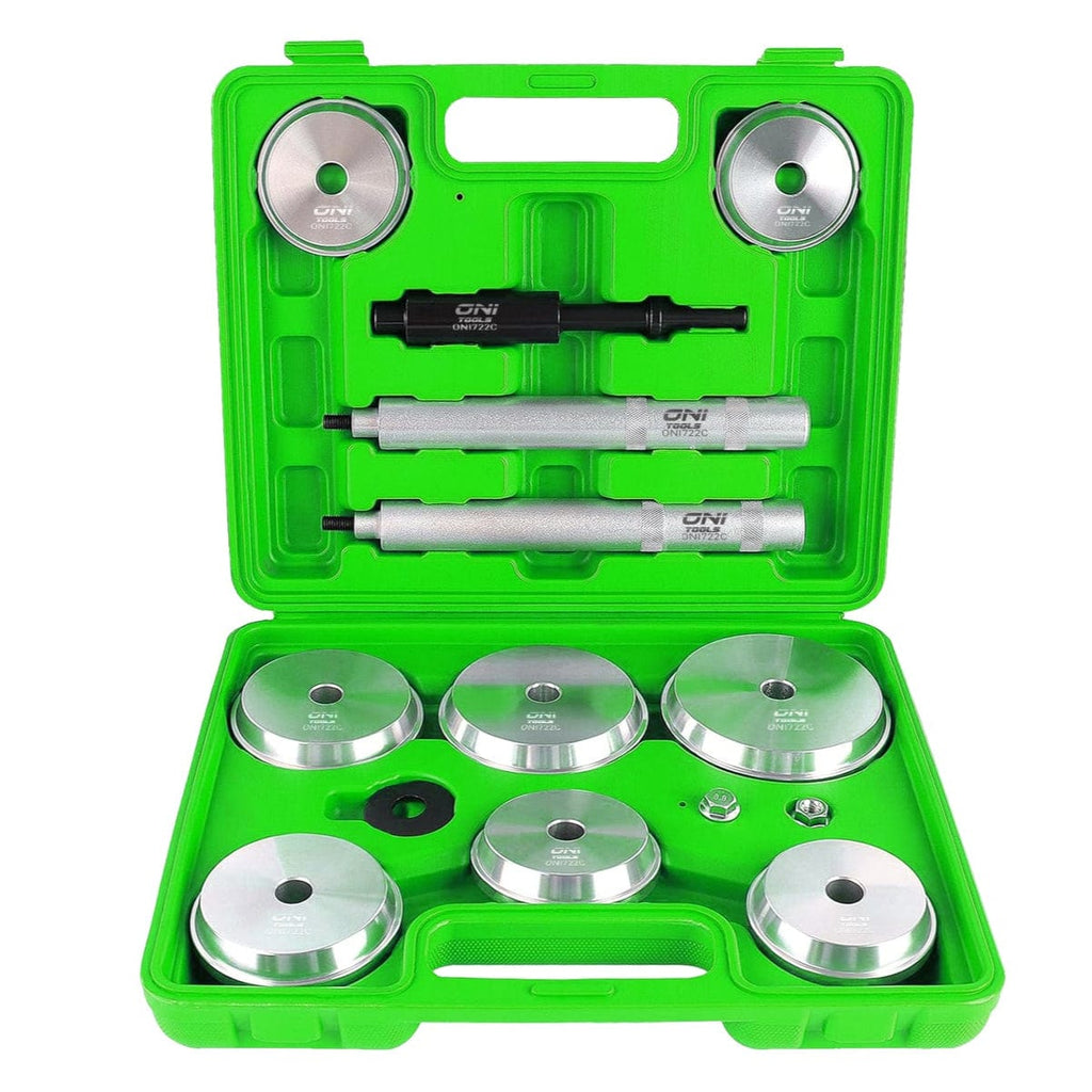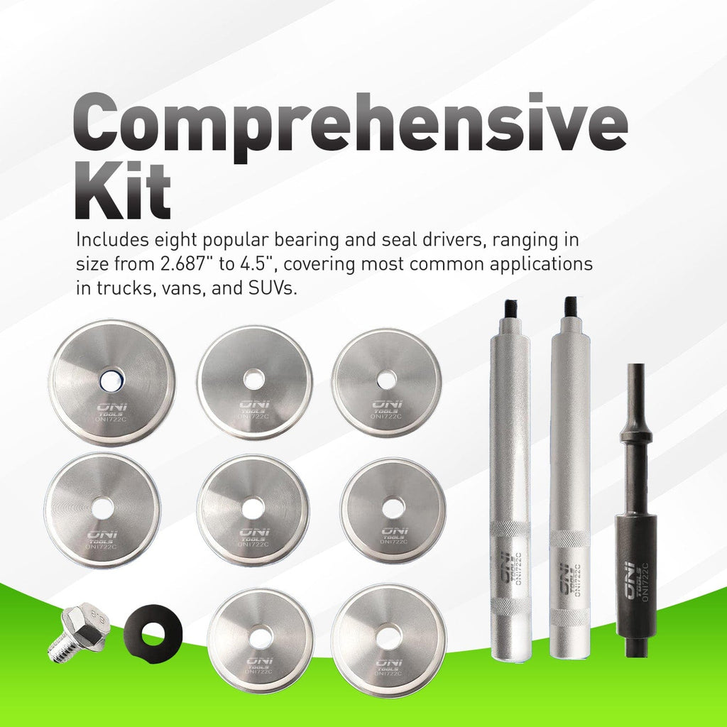 Tackle differential bearing work with confidence. The Oni Tools Pinion Bearing Race Driver Set includes eight precision-machined discs that fit 2.687"–4.125" races—covering the most common 1/2-ton and 3/4-ton truck applications. The two-piece 16" extension reaches deep into housings so you can seat inner/outer pinion races squarely and fast. For speed on stubborn carriers, switch to the included .401-shank pneumatic adapter; for delicate setups, use the manual handle for controlled impacts. This set is an excellent alternative to OEM tool numbers Lisle 59400, OTC 4409, Mac BRD594, and Cornwell LS59400. Whether you’re a driveline specialist or a weekend builder doing gears and bearings, Oni Tools helps prevent cocked races, reduces rework, and keeps your axle builds clean and repeatable. Verify by race OD 2-11/16" to 4-1/8" for perfect coverage.