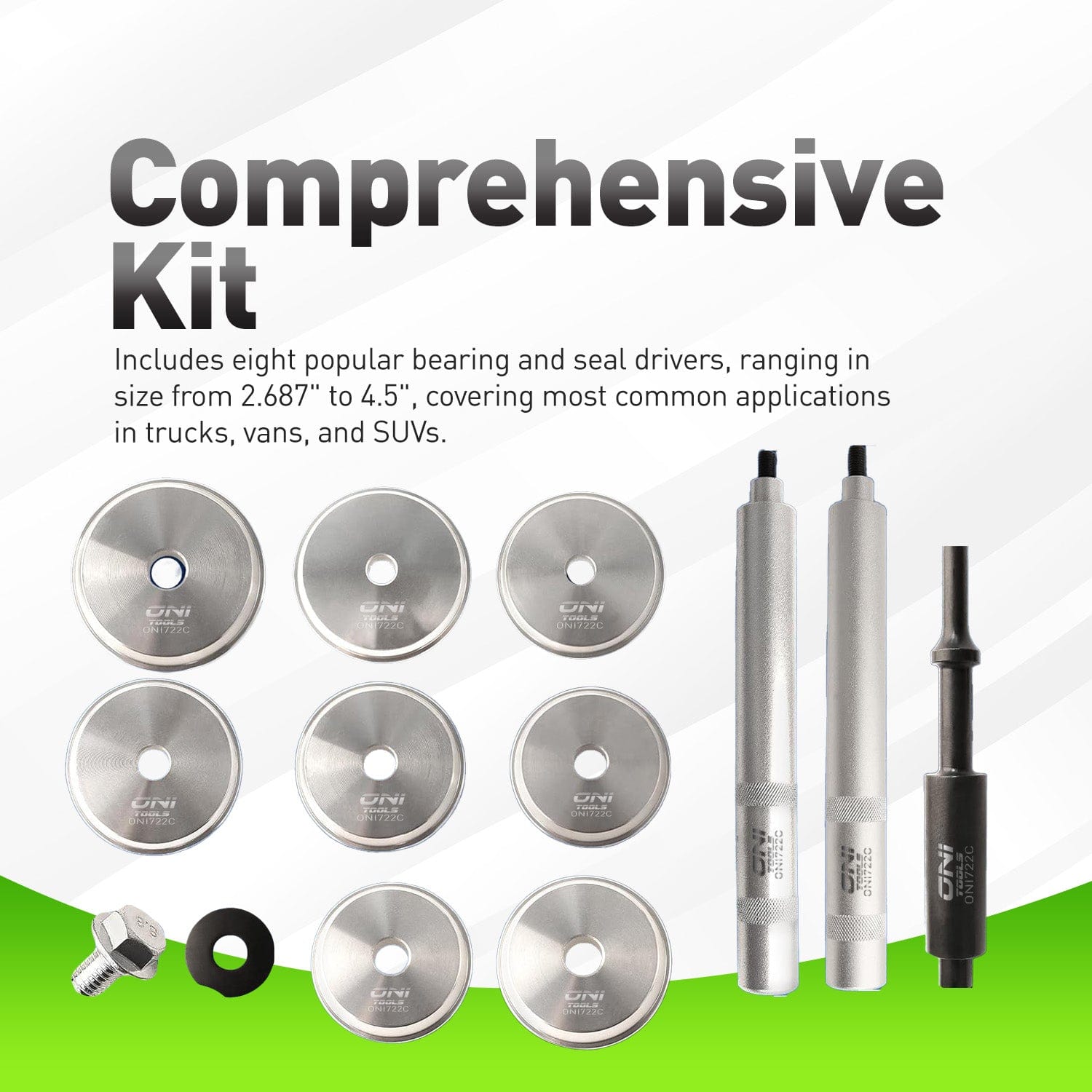 • 8 driver discs cover 2.687"–4.125" races for most 1/2 & 3/4-ton trucks; includes deep-reach handle and air-hammer adapter for tight differentials.