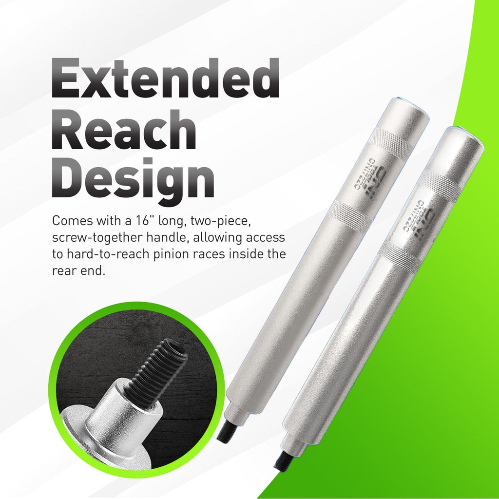 • Knurled, two-piece 16" extension improves control when driving inner/outer pinion bearing races without damaging housings.