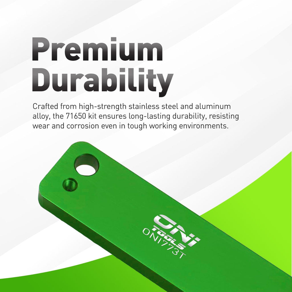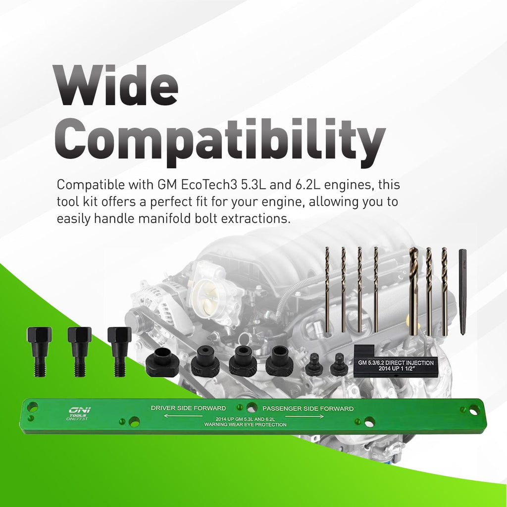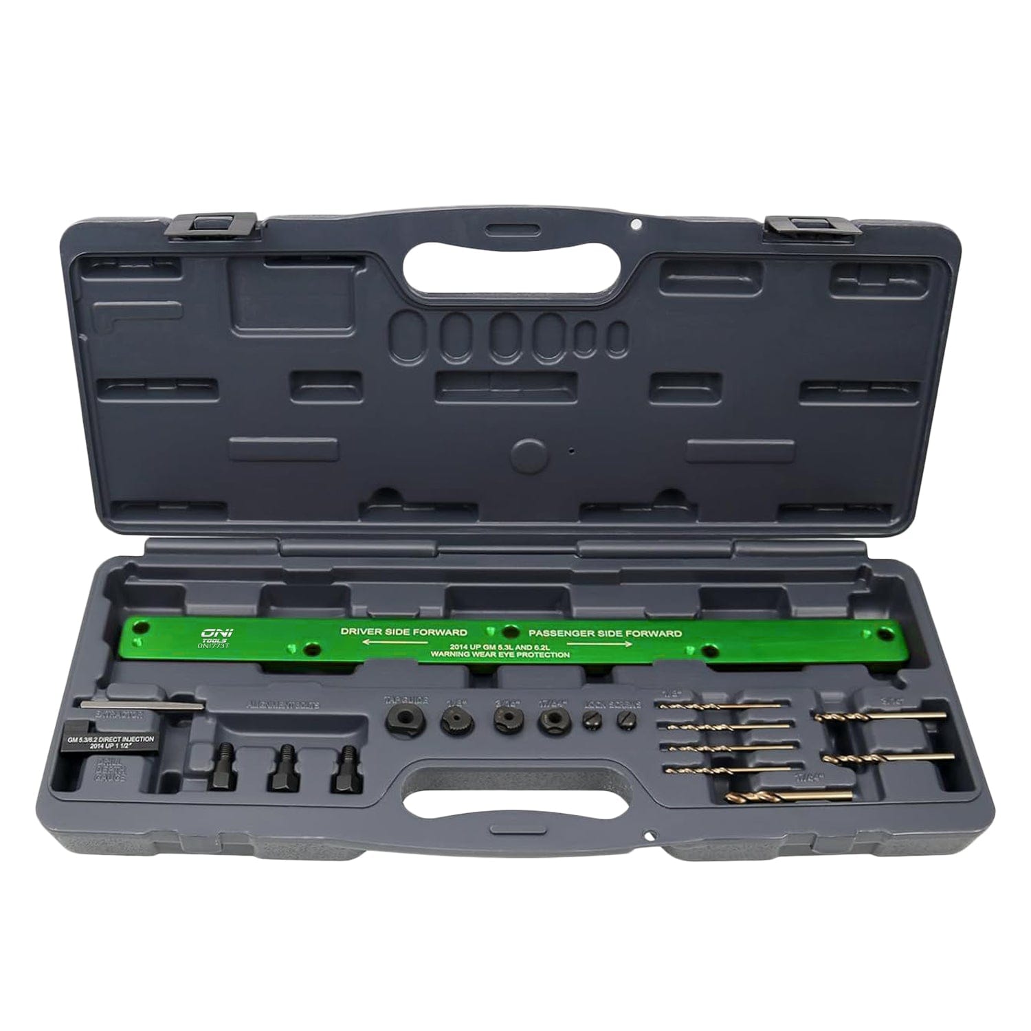 Stuck or broken exhaust manifold bolts are common on GM EcoTec3 V8s. The Oni Tools Exhaust Manifold Broken Bolt Drill Template fixes them fast—without risking cylinder-head damage. Our hardened alignment plate anchors to existing holes with tapered guide bolts, then slip-fit bushings let you move from port to port without re-centering. A depth reference keeps drilling on-spec, and the included tap-size guide supports clean thread repair when extraction isn’t possible. Engineered for GM EcoTec3 5.3L (L83) and 6.2L (L86/L87) applications on Chevrolet Silverado/Suburban/Tahoe, GMC Sierra/Yukon, and Cadillac Escalade. Built for busy shops yet simple enough for weekend techs, this kit restores sealing surfaces, saves labor hours, and protects high-value heads—everything you need for reliable manifold bolt service on modern GM trucks and SUVs.