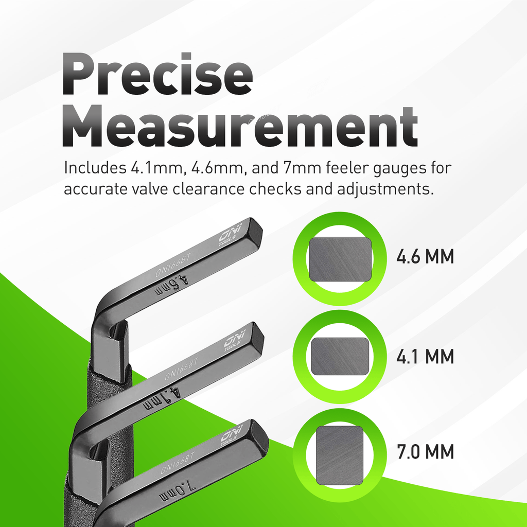 Dial in Jake Brake lash fast with the Oni Tools 3-Piece Engine Brake Feeler Gauge Set. Purpose-built for heavy-duty diesel service, this kit includes 4.1mm and 4.6mm gauges for Detroit DD13/DD15/DD16 engines and a 7.0mm gauge for Cummins ISX. The angled, low-profile tips slide cleanly between the actuator piston and exhaust valve, allowing you to measure lash precisely without fighting tight clearances. Blades are precision-ground from hardened alloy steel and paired with textured handles for secure grip under shop conditions. The set replaces OEM references W470589022300 (4.1mm), W470589042300 (4.6mm), and 3163530 (7.0mm), aligning with Detroit serial-break lash specs where applicable. Whether you’re a fleet tech or DIY owner-operator, this kit helps prevent brake drag, protects valvetrain components, and keeps engine braking performance on point.