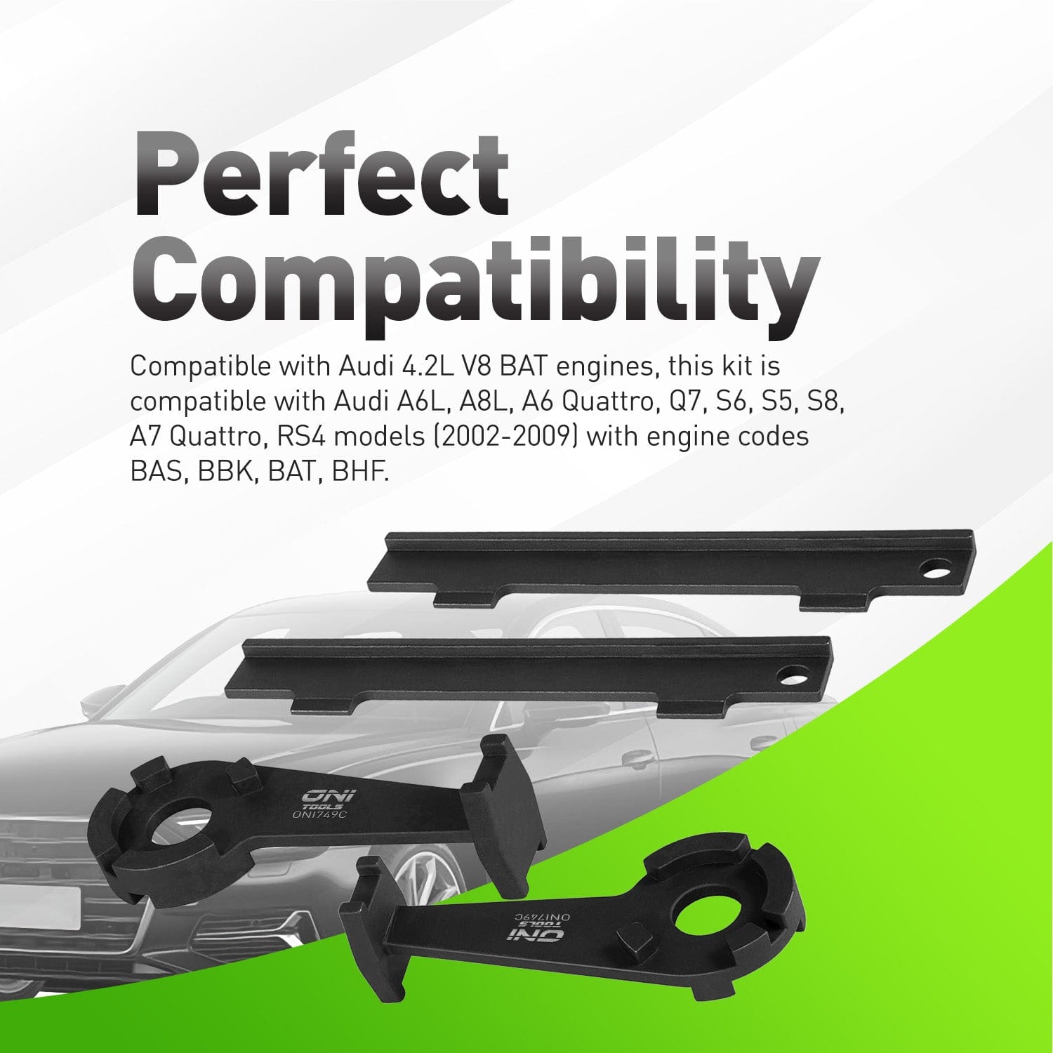 Take the guesswork out of Audi/VW 4.2L V8 timing service. This Oni Tools kit includes camshaft locking bars and hall-sensor setting gauges plus a TDC crank pin and chain wedge—everything you need to lock cams, set the sensor rotor rings, and secure the crank at top dead center during timing chain work. It’s an alternative to factory tools T40046, T40047, 3242, and 3409 and is engineered for the 4.2 R-CAT/40-valve V8 used from 2002–2009. Typical applications include Allroad (BAS), S4 (BBK/BHF), and A6 Quattro (BAT); many A8 4.2 engines share these fixtures (verify engine code). Precision-machined, hardened steel delivers stable clamping and repeatable alignment to help eliminate rework and warning lights after startup. Ideal for professional shops and skilled DIYers tackling chain service, cam cover reseals, or top-end work.