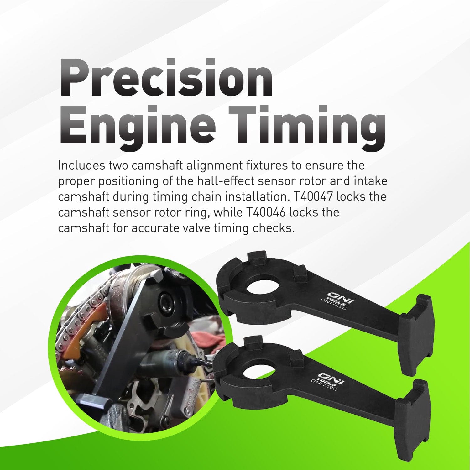 Saves hours on chain/timing jobs; prevents cam drift and sensor ring misalignment during installation and verification.